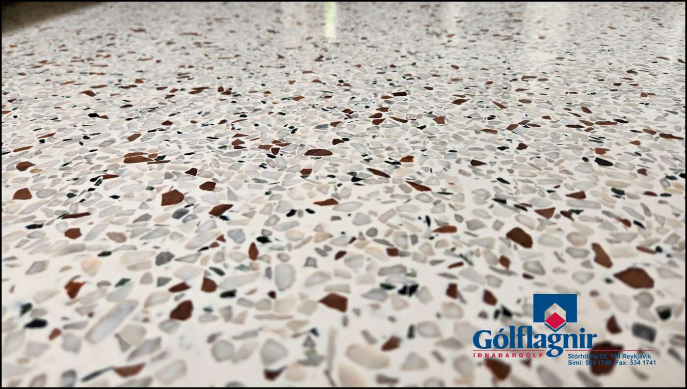 Topp Terrazzo er epoxy steypa með háu innihaldi af fylliefnum af margvíslegum gerðum og í ýmsum litum. Fylliefnin geta verið marmari og bergtegundir af ýmsum gerðum bundið epoxy resin í ýmsum litum. Þykkt er frá 8-15 mm eftir grófleika fylliefnis.